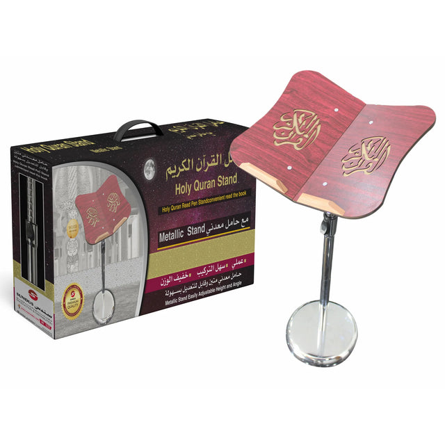 This Qur'an stand is easy to assemble and features an adjustable height. The base and stand are made from chrome, adding a touch of elegance to the design, while the Qur'an holder is made from high-quality wood for durability.