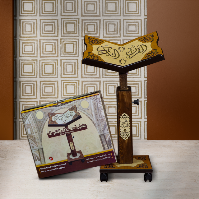 مصنوع من الخشب الطبيعي بتصميم وزخرفة إسلامية مميزة. الحامل قابل لتعديل الارتفاع ليناسب وضع الجلوس أو الوقوف، ومزود بعجلات لسهولة النقل والتحريك.